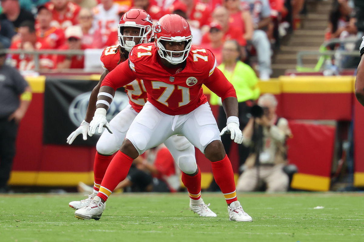 September 14, 2025: Kansas City Chiefs offensive tackle Josh Simmons 71 looks to block during an NFL, American Football Herren, USA football game against the Philadelphia Eagles at GEHA Field at Arrowhead Stadium in Kansas City, MO. /CSM Kansas City United States of America – ZUMAc04_ 20250914_zma_c04_675 Copyright: xDavidxSmithx