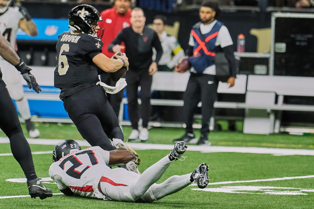 November 23, 2025, New Orleans, Louisiana, U.S: November 23, 2025, New Orleans, Louisiana, USA: top to bottom New Orleans Saints quarterback Tyler Shough is sacked by Atlanta Falcons defensive end James Pearce Jr. an NFL, American Football Herren, USA regular season game. The Falcons beat the Saints 10-24. New Orleans U.S – ZUMAa14_ 20251123_zaf_a14_011 Copyright: xDanxAndersonx