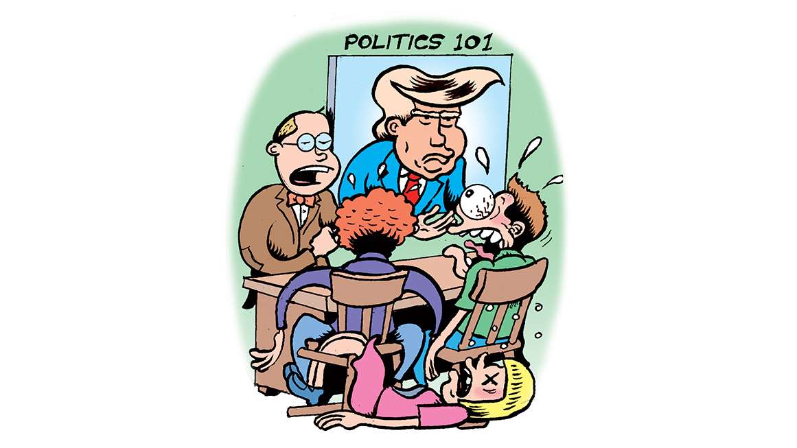 Illustration: Peter Bagge Public school officials in England reported a politics teacher to authorities after he showed videos of U.S. President Donald Trump to his 17- and 18-year-old students during a lesson on the 2024 election. Officials said the videos could have caused "emotional harm" and might be seen as a "hate crime." The school refused to discuss the matter, but the teacher claimed he was essentially forced from his job as a result of the complaint.