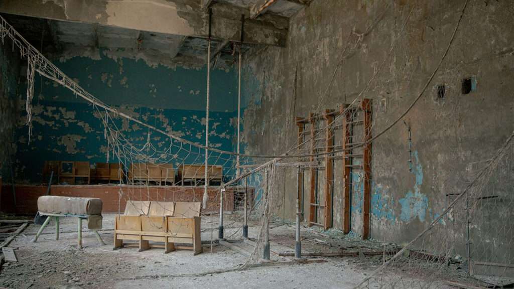 Photo: An abandoned school in the exclusion zone, 2026; Louis Lemaire-Sicre/Le Pictorium/Alamy