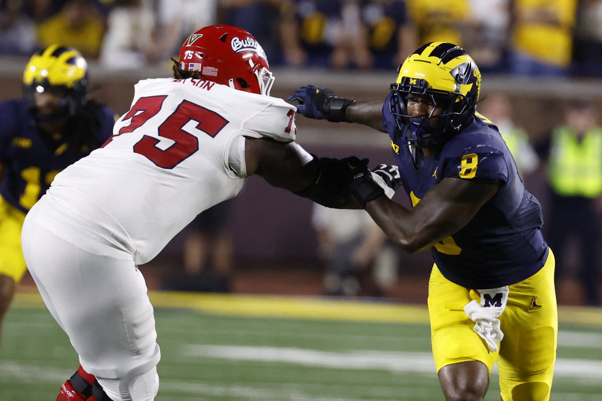 Aug 31, 2024; Ann Arbor, Michigan, USA; Fresno State Bulldogs offensive lineman Braylen Nelson (75) blocks Michigan Wolverines defensive end Derrick Moore (8) in the second half at Michigan Stadium. Mandatory Credit: Rick Osentoski-USA TODAY Sports