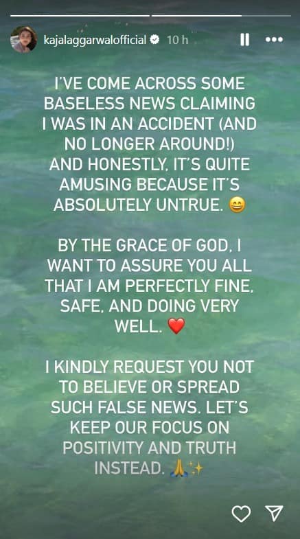 "I've come across some baseless news claiming I was in an accident (and no longer around!) and honestly, it's quite amusing because it's absolutely untrue," Kajal wrote on her Instagram Stories as well as X, formerly known as Twitter.