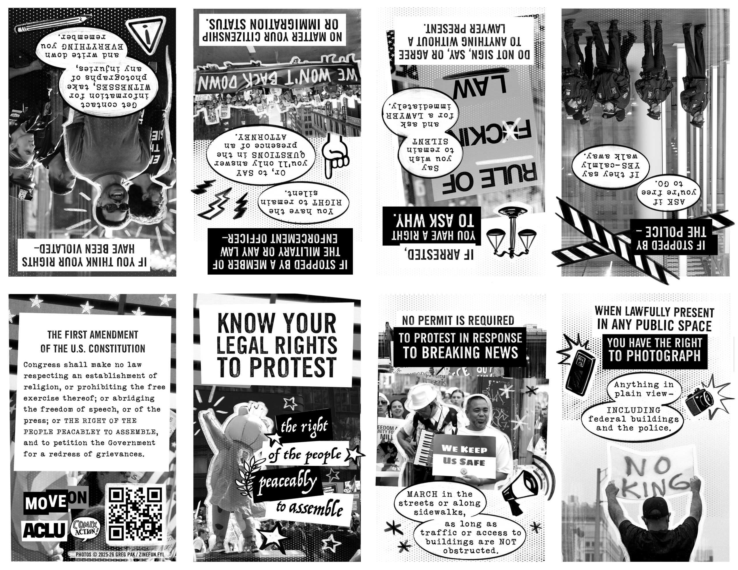 This zine was adapted from ACLU’s “Protester’s Rights” resources, and designed by Christine Norrie and Greg Pak, artists with Comix Action.