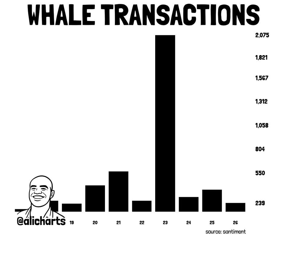 Crypto analyst Ali Martinez, citing Santiment data, noted that whale transactions on the Ethereum network spiked from 123 on March 21 to 2,055 on March 24 — a 1,500% increase in three days. By March 26 they had dropped back to 239.