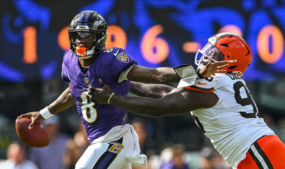 Baltimore Ravens quarterback Lamar Jackson 8 shakes off Cleveland Browns defensive tackle Maliek Collins 96 during a first down pass to Baltimore Ravens wide receiver Zay Flowers during the third quarter of the Ravens home opener at M&T Bank Stadium in Baltimore, Maryland, on Sunday, September 14, 2025. PUBLICATIONxNOTxINxUSA BAL20250914137 DAVIDxTULIS