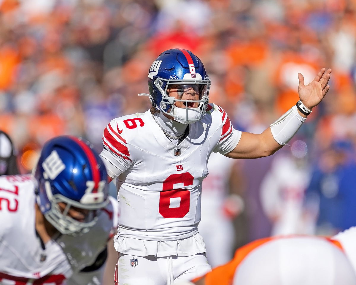 October 20, 2025, Denver, Colorado, USA: Giants QB JAXSON DART yells a change of play at the line of scrimmage during the 1st. Half at Empower Field at Mile High Sunday afternoon. Broncos beat the Giants 33-32. Denver USA – ZUMAav4_ 20251020_zaf_av4_019 Copyright: xHectorxAcevedox