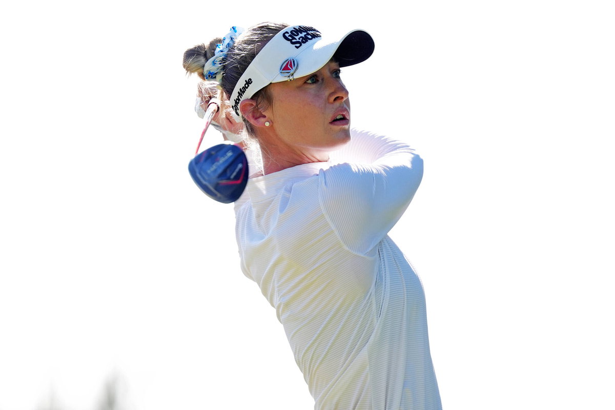 LAS VEGAS, NV – APRIL 05: LPGA, Golf Damen golfer Nelly Korda plays her tee shot on the 10th hole during the final round of the Aramco Championship on April 5, 2026, at Shadow Creek Golf Course in Las Vegas, Nevada. Photo by Brian Spurlock/Icon Sportswire GOLF: APR 05 LPGA Aramco Championship EDITORIAL USE ONLY Icon26040543