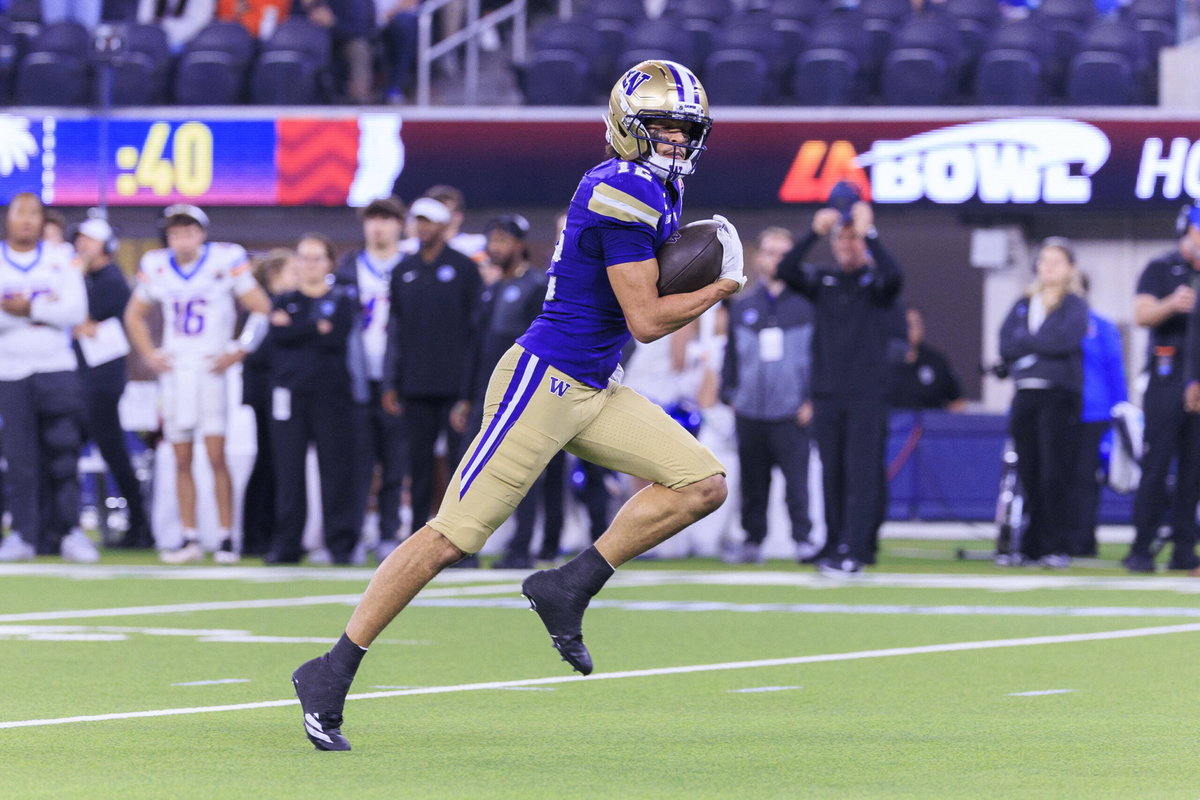 December 13, 2025, Inglewood, California, USA: 12 Denzel Boston, WR of the Washington Huskies completes the pass and runs to the end zone during the Bucked Up LA Bowl Hosted by Gronk against Boise State Broncos on Saturday December 13, 2025 at SoFI Stadium in Inglewood, California. ARIANA RUIZ/PI Inglewood USA – ZUMAp124 20251213_zaa_p124_012 Copyright: xArianaxRuizx