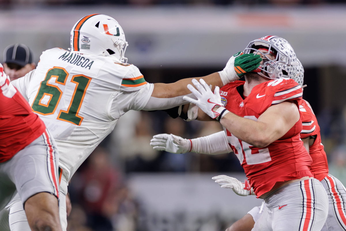 December 31, 2025, Arlington, Texas, U.S: Miami Hurricanes offensive lineman Francis Mauigoa 61 hits Ohio State Buckeyes defensive end Caden Curry 92 on the facemark on a block during the game between the Miami Hurricanes and the Ohio State Buckeyes at AT&T Stadium, Arlington, Texas. Arlington U.S – ZUMAs304 20251231_zaf_s304_007 Copyright: xScottxStuartx