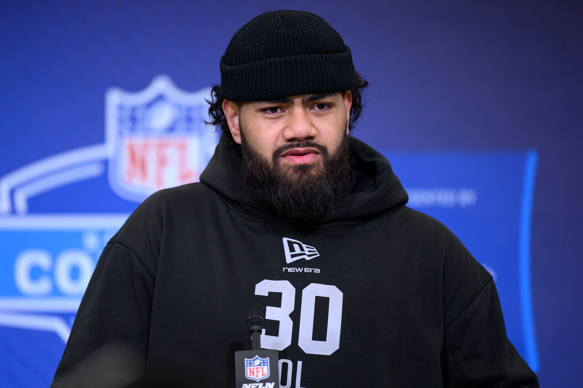 INDIANAPOLIS, IN – FEBRUARY 28: Penn State offensive lineman Olaivavega Ioane answers questions from the media during the NFL, American Football Herren, USA Scouting Combine on February 28, 2026 at the Indiana Convention Center in Indianapolis, IN. Photo by Zach Bolinger/Icon Sportswire NFL: FEB 28 Scouting Combine EDITORIAL USE ONLY Icon2602280244