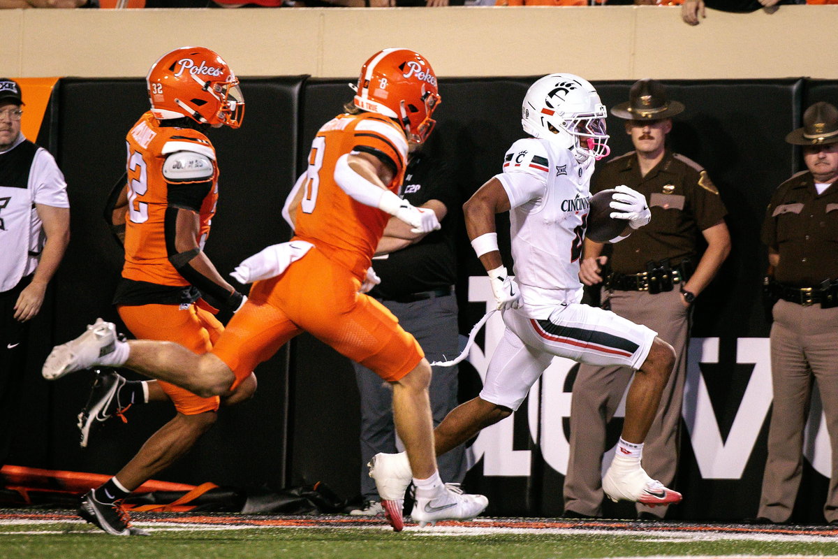 NCAA, College League, USA Football: Cincinnati at Oklahoma State Oct 18, 2025 Stillwater, Oklahoma, USA Cincinnati Bearcats wide receiver Cyrus Allen 4 runs into the end zone for a touchdown during the first half against the Oklahoma State Cowboys at Boone Pickens Stadium. Stillwater Boone Pickens Stadium Oklahoma USA, EDITORIAL USE ONLY PUBLICATIONxINxGERxSUIxAUTxONLY Copyright: xWilliamxPurnellx 20251018_djc_pa6_288