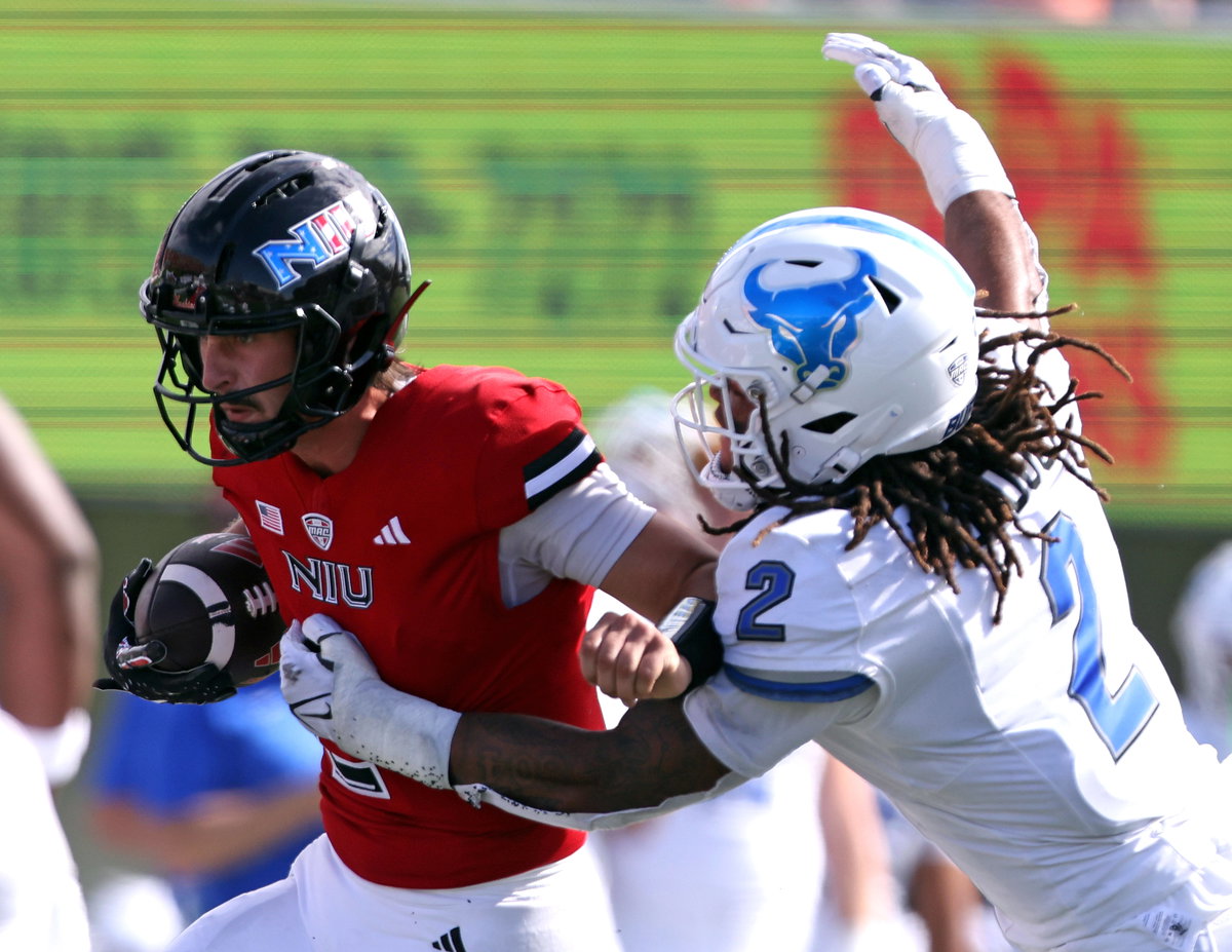 September 21, 2024, Dekalb, Il, USA: Sept 21, 2024 DeKalb, Illinois, USA: Northern Illinois ETHAN HAMPTON 2 runs as Buffalo s RED MURDOCK 2 defends during the Mid-American Conference opener. Buffalo won, 23:20. Dekalb USA – ZUMAbm6_ 20240921_znp_bm6_004 Copyright: xH.xRickxBammanx