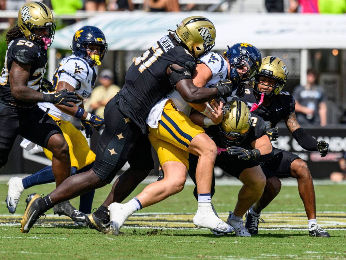 October 18, 2025: West Virginia Mountaineers quarterback Scotty Fox Jr. 15 is sacked by UCF Knights defensive end Malachi Lawrence 51 in the first half during NCAA, College League, USA football at Acrisure Bounce House in Orlando, FL. Romeo T Guzman/CSM Orlando USA – ZUMAcg2_ 20251018_faf_cg2_002 Copyright: xRomeoxGuzmanx
