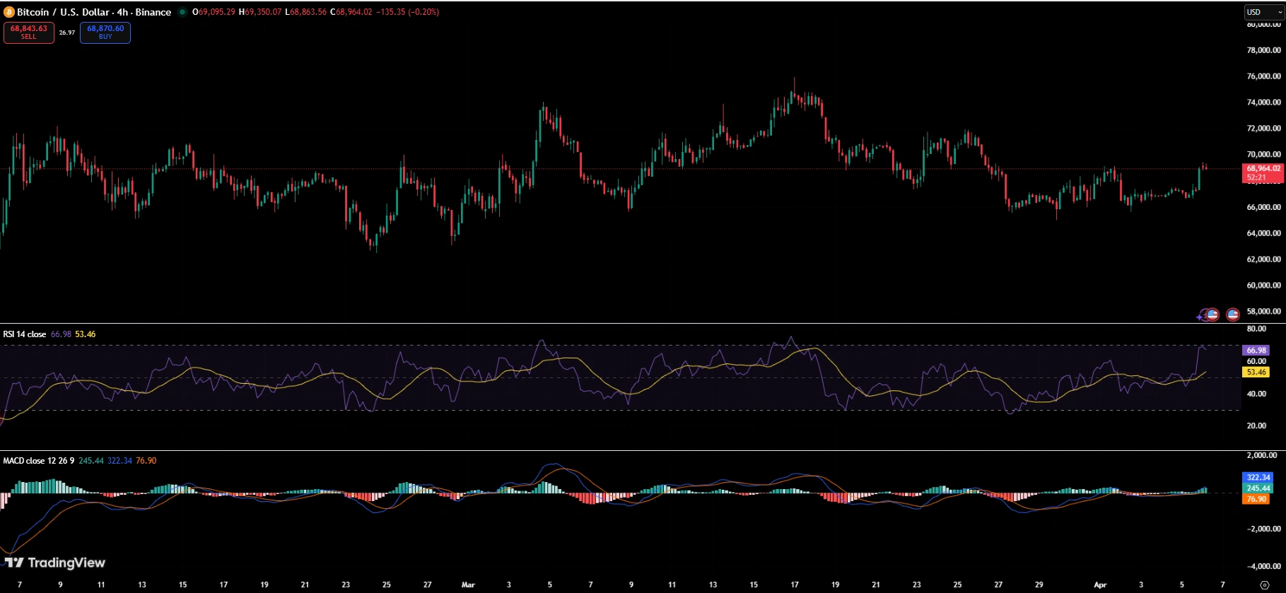 The 4-hour chart on Binance shows BTC consolidating after a move off the lows near $65,000 seen in late March. The RSI sits at 66.98 on the faster line and 53.46 on the signal, indicating momentum without being technically overbought. The MACD shows a positive crossover with some histogram expansion, but neither reading is aggressive enough to suggest a breakout is imminent.