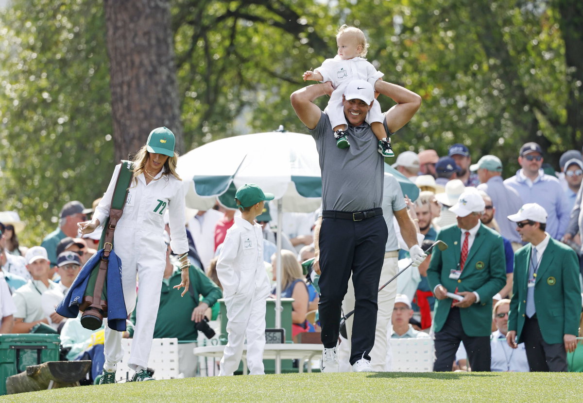 Brooks Keopka carries his son Crew as he walks with his wife Jena Sims on the 1st hole during the 2025 Masters Par 3 Contest at Augusta National Golf Club in Augusta, Georgia, on Wednesday, April 9, 2025. The 2025 Masters Golf tournament begins on Thursday, April 10. PUBLICATIONxINxGERxSUIxAUTxHUNxONLY AUG20250409886 JOHNxANGELILLO