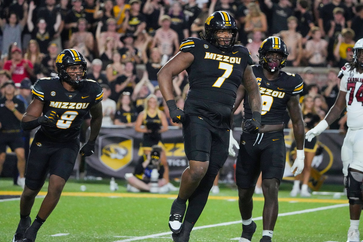 NCAA, College League, USA Football: South Carolina at Missouri Sep 20, 2025 Columbia, Missouri, USA Missouri Tigers defensive tackle Chris McClellan 7 celebrates against the South Carolina Gamecocks after a sack during the first half of the game at Faurot Field at Memorial Stadium. Columbia Faurot Field at Memorial Stadium Missouri USA, EDITORIAL USE ONLY PUBLICATIONxINxGERxSUIxAUTxONLY Copyright: xDennyxMedleyx 20250920_dam_sm8_246