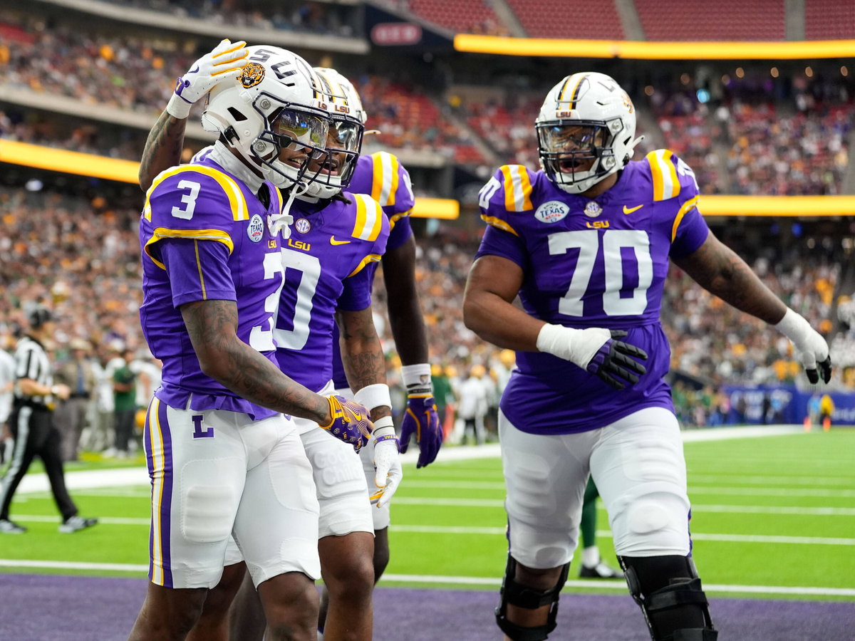 Wide receiver Chris Hilton Jr. LSU Tigers, 03 celebrates with wide receiver Zavion Thomas LSU Tigers, 0 and offensive lineman Miles Frazier LSU Tigers, 70 after scoring a touchdown USA, LSU Tigers vs Baylor Bears, College Football, Texas Bowl Game, 31.12.2024 USA, LSU Tigers vs Baylor Bears, College Football, Texas Bowl Game, 31.12.2024 Houston *** Wide receiver Chris Hilton Jr LSU Tigers, 03 celebrates with wide receiver Zavion Thomas LSU Tigers, 0 and offensive lineman Miles Frazier LSU Tigers, 70 after scoring a touchdown USA, LSU Tigers vs Baylor Bears, College Football, Texas Bowl Game, 31 12 2024 USA, LSU Tigers vs Baylor Bears, College Football, Texas Bowl Game, 31 12 2024 Houston Copyright: xEibner-Pressefoto/ScottxColemanx EP_SCN