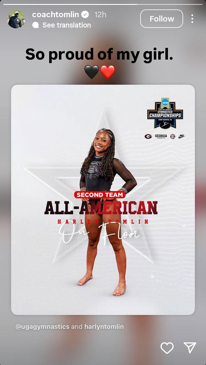 Mike Tomlin is going through another “Proud Dad” moment. Since leaving the Pittsburgh Steelers in January, the former head coach has been a staunch follower of his daughter, Harlyn “Harley” Tomlin’s career. A few weeks back, Harlyn and the Georgia Gymnastics secured a trip to Fort Worth and became one of the top eight teams in the nation. Her dad shared her achievements on social media. Well, this time she has made the Second Team All-American in gymnastics.