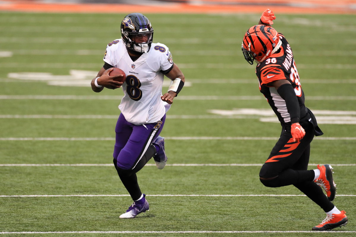 CINCINNATI, OH – JANUARY 03: Baltimore Ravens quarterback Lamar Jackson 8 carries the ball during the game against the Baltimore Ravens and the Cincinnati Bengals on January 3, 2021, at Paul Brown Stadium in Cincinnati, OH. Photo by Ian Johnson/Icon Sportswire NFL, American Football Herren, USA JAN 03 Ravens at Bengals Icon210103086