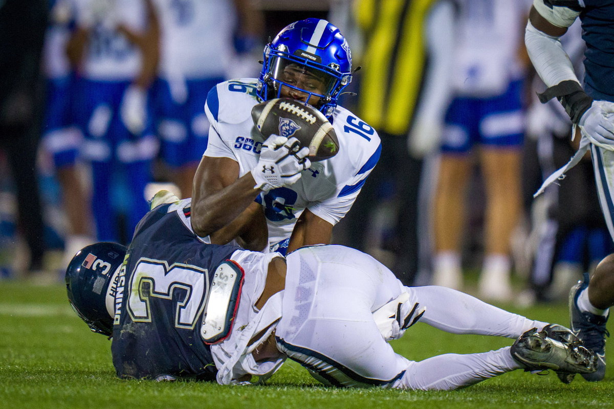 NCAA, College League, USA Football 2024: Georgia State vs UCONN NOV 01 November 1, 2024: Georgia State Panthers wide receiver Ted Hurst 16 holds onto a reception while being tackled by Connecticut Huskies defensive back D Mon Brinson 3 during an NCAA football game at Pratt & Whitney Stadium in East Hartford, CT. Rusty Jones/Cal Media Credit Image: Â Rusty Jones/Cal Sport Media East Hartford Ct USA EDITORIAL USE ONLY Copyright: xx ZUMA-20241101_zma_c04_083.jpg RustyxJonesx csmphotothree313115