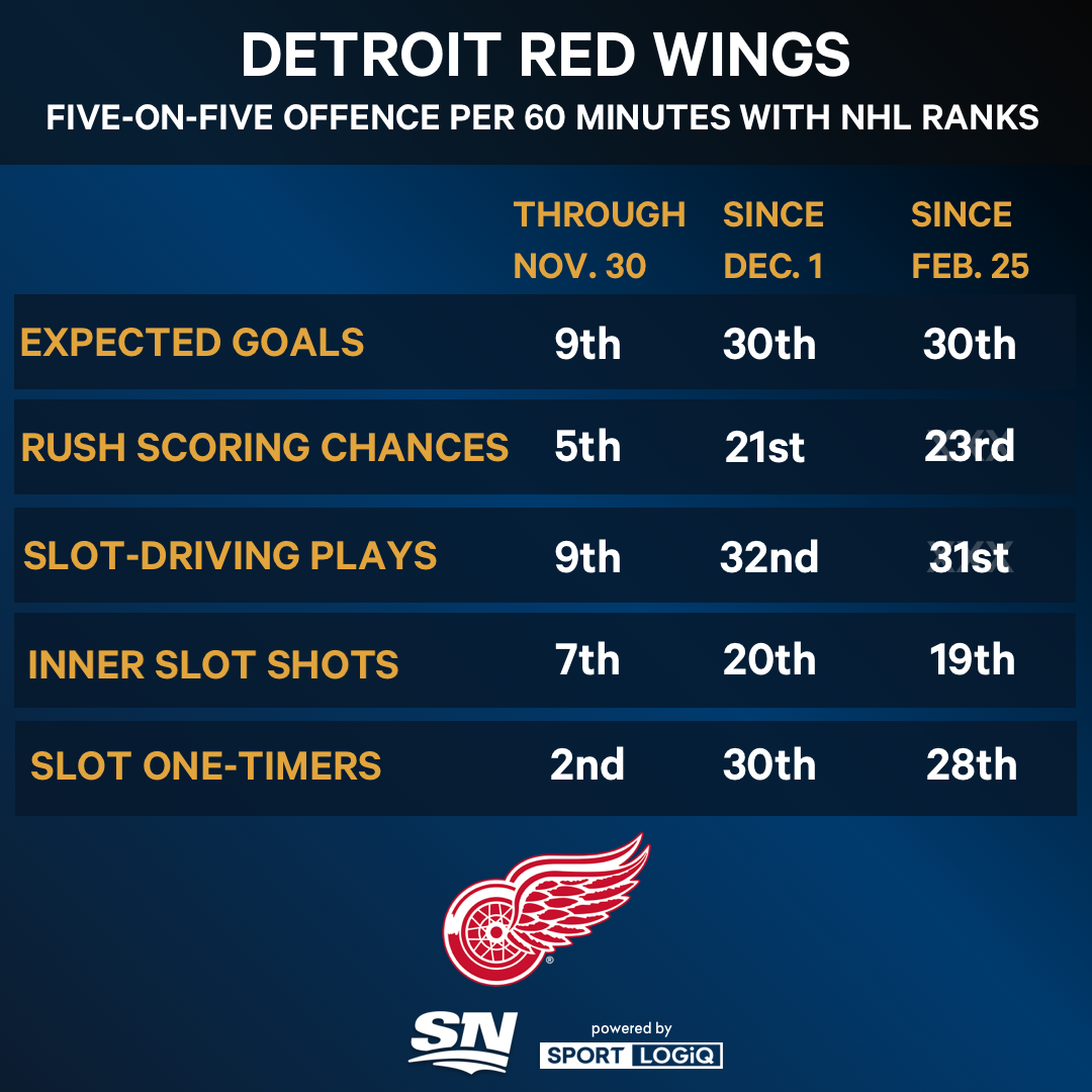 Even after scoring four times at five-on-five Sunday, Detroit has just 33 such goals (2.14 per 60) in 19 games since the Olympic break. Only the Toronto Maple Leafs (32) and Vancouver Canucks (31) have fewer in that span.