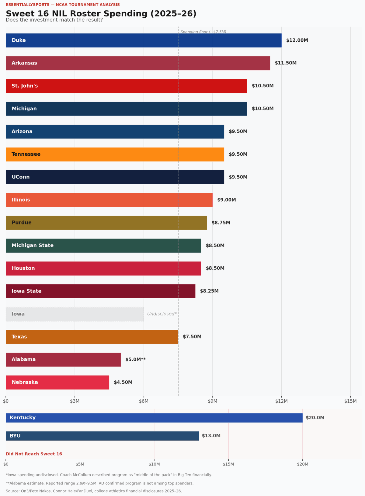 There’s a general buy-in when it comes to the tournament. Based on the spending habits of this year’s Sweet 16 teams, that expenditure floor falls in the neighborhood of $7 to $8 million.