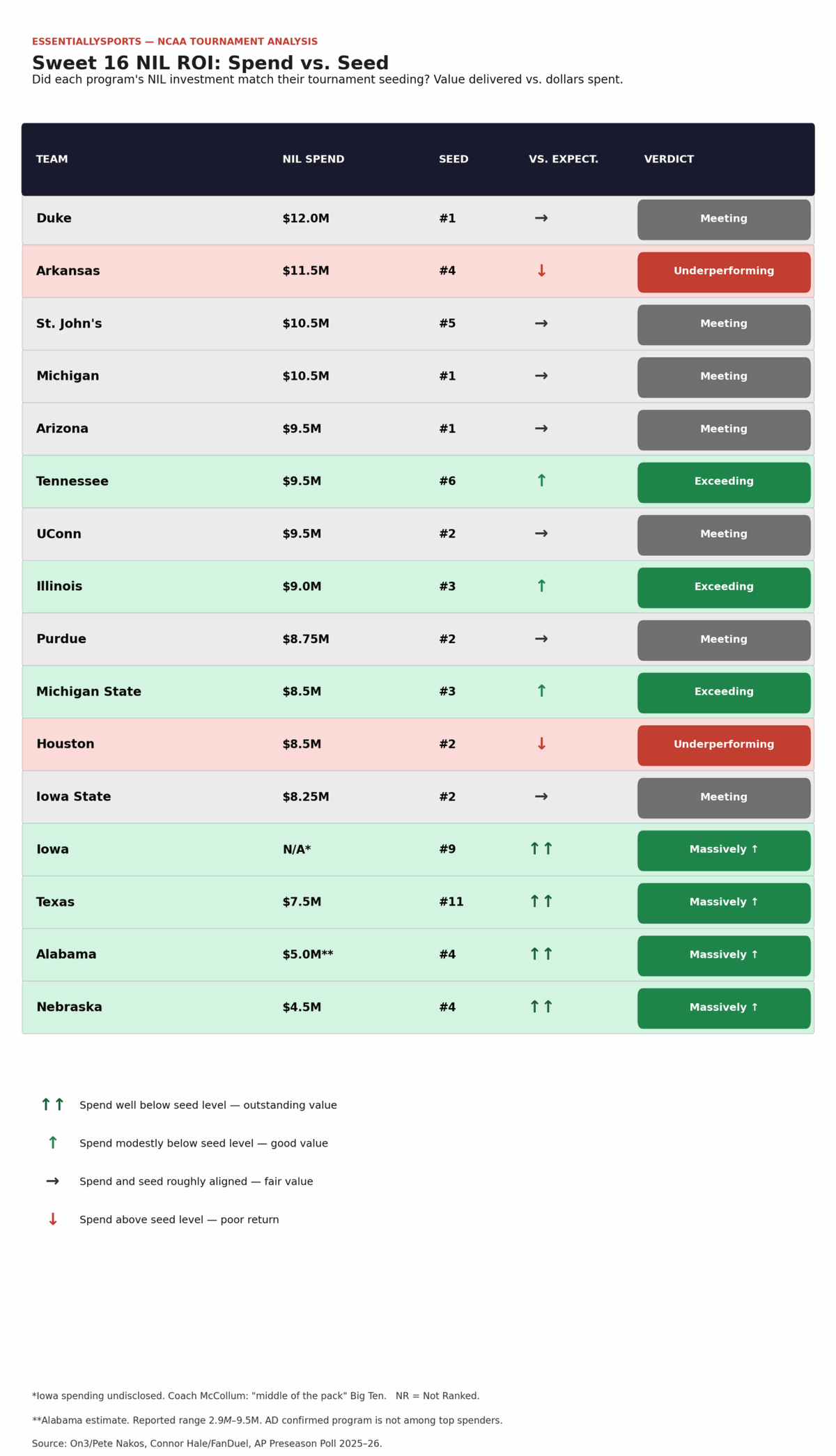 So what does this year’s NIL money afford you? We take a look at the rate of return for the 2026 Sweet 16 teams.