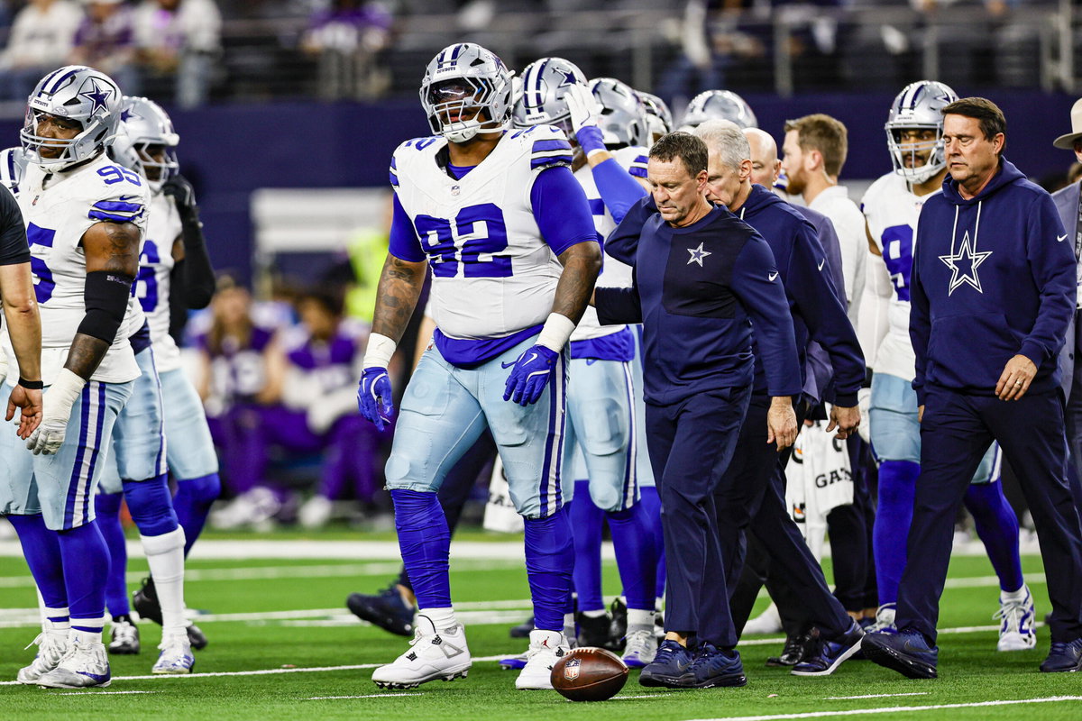 ARLINGTON, TX – DECEMBER 14: Dallas Cowboys defensive tackle Quinnen Williams 92 walks off the field after being shaken up during the game between the Dallas Cowboys and the Minnesota Vikings on December 14, 2025 at AT&T Stadium in Arlington, Texas. Photo by Matthew Pearce/Icon Sportswire NFL, American Football Herren, USA DEC 14 Vikings at Cowboys EDITORIAL USE ONLY Icon1692512149088