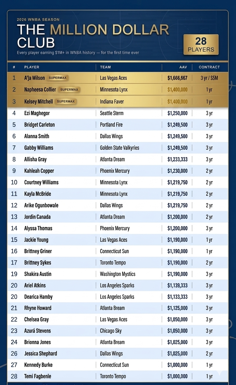Once all three sign as expected, the Million Dollar Women club will be up to 30 members to tip off the 2026 season.