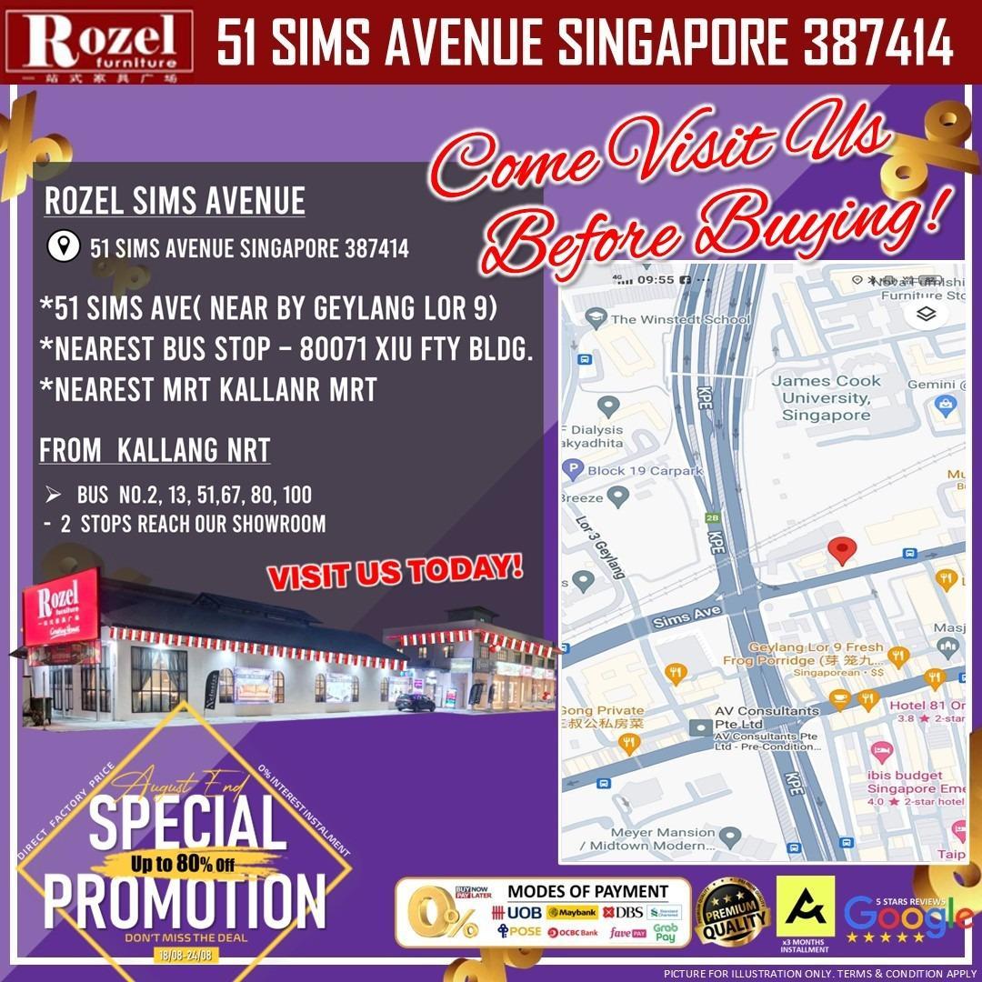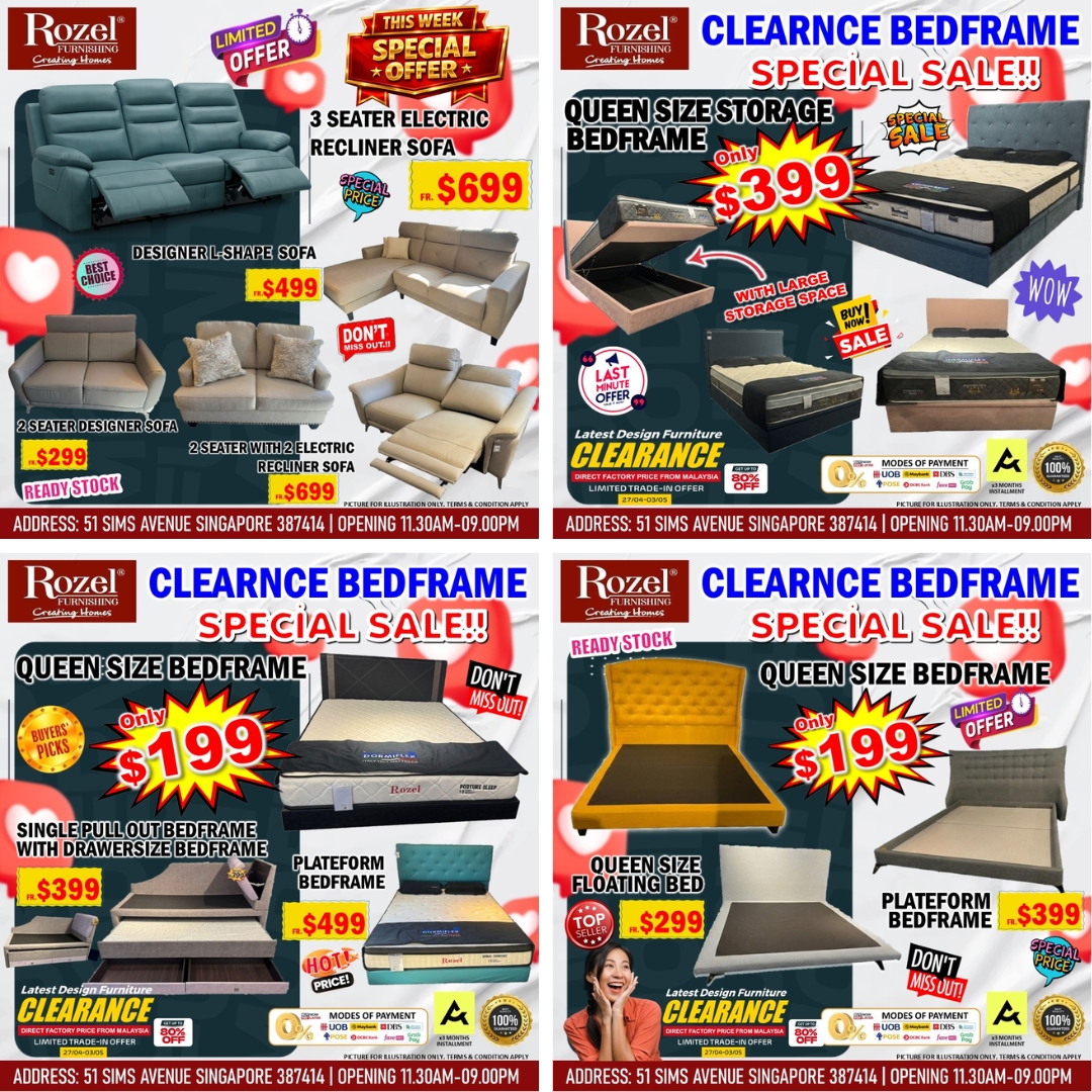 The Factory-Direct Furniture Tentage Sale is now on at 51 Sims Avenue, Singapore 387414, for a limited time only—ending 3rd May 2026. Don’t miss this opportunity to turn your home into a stylish sanctuary with exclusive deals only Rozel can offer.